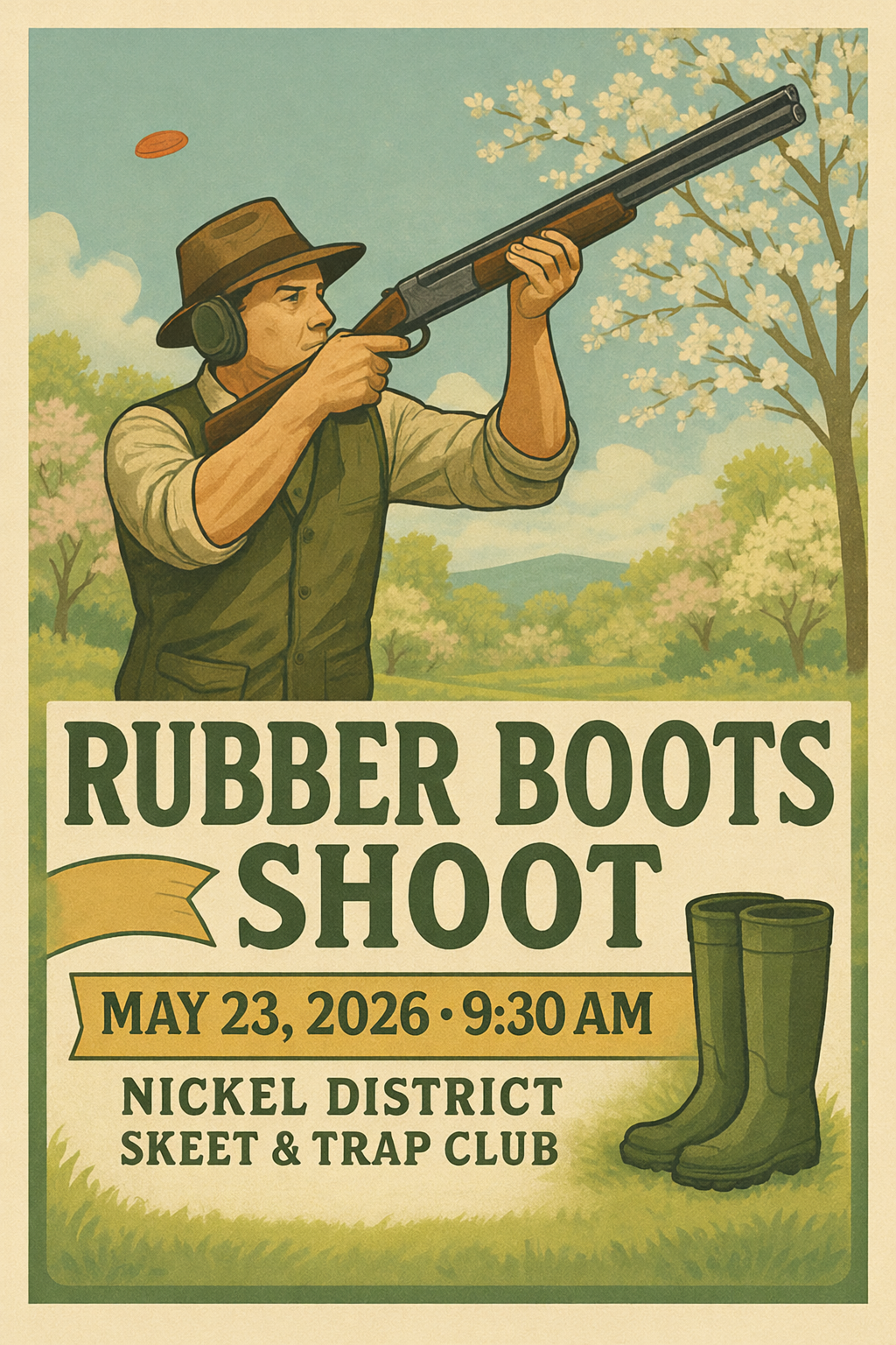 Back to All Events Spring Rubber Boots Shoot Saturday, May 23, 2026 9:00 a.m. 2:00 p.m. Nickel District Skeet and Trap Club 101 C Johnson Road Worthington, ON, P0M 3H0 Canada (map) Google Calendar ICS
